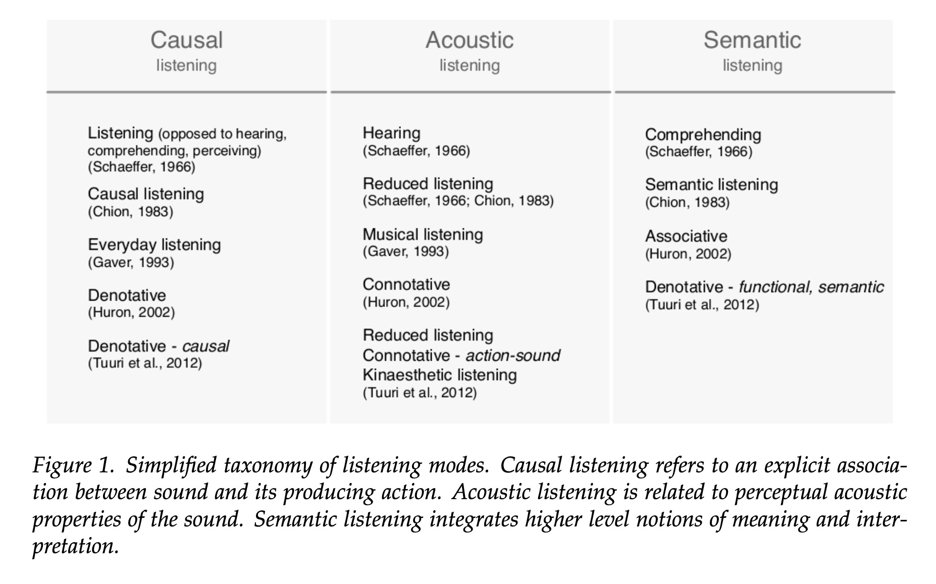 When we ask someone to talk about what they have heard, their responses vary greatly depending on the type of listening they employed. According to Chion there are three distinct types of listening: